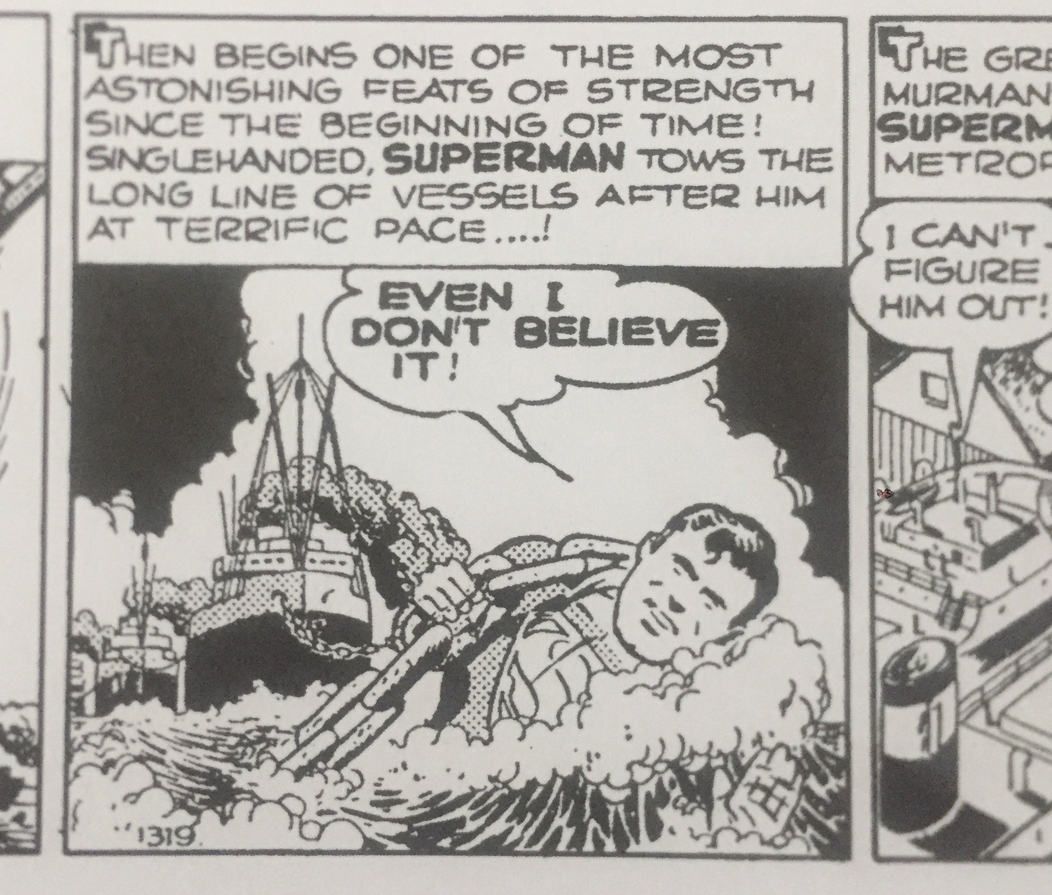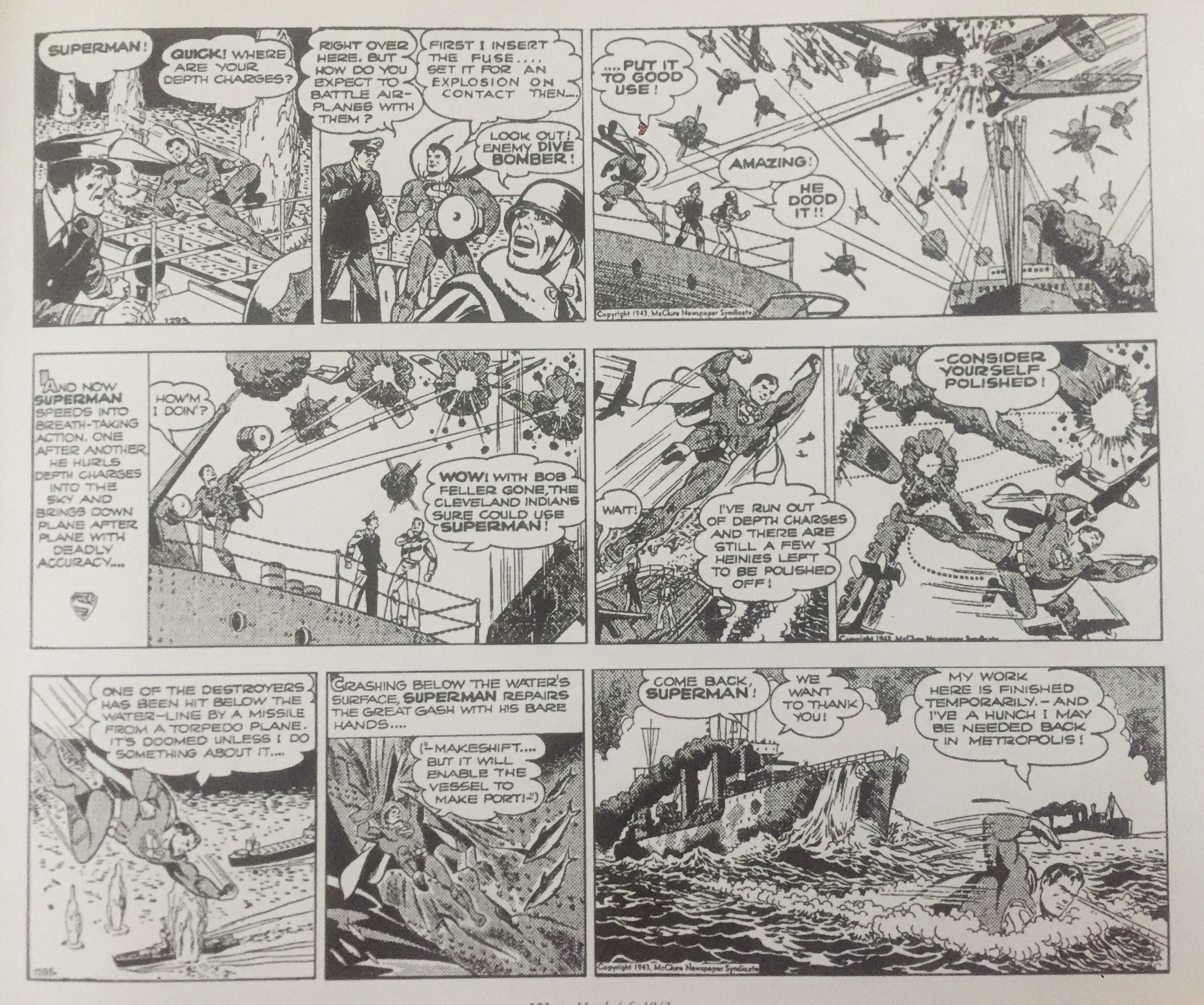 A few stories which did feature Superman fighting Nazis directly, however, were included from the newspapers, both the colored Sundays and black and white dailies. Apparently, the higher ups at DC/National hesitated to include war stories in the mainly kids-aimed comics, but were totally okay with such stories in the newspapers, read just as much by adults. A few newspaper stories were included in Thomas’ “war years” books, but only a handful.