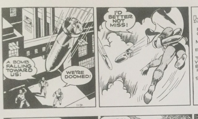 The majority of content was taken from Superman’s comic books and, aside from the covers, found the Man of Steel squaring off merely against villains from fictional, Germany-esque countries, or just the mention of them. At best, the comics featured Superman fighting fifth columnists on the home soil trying to sabotage a factory or munitions plant. Barring that, there were few, if any, mentions of Nazis or Superman fighting their military head on, which was disappointing considering that that was why I bought the book. I’m fully cognizant that Supes was never directly allowed by DC (then National) to fight in Europe or the Pacific during the war, as it would mean the conflict would end in minutes, but come on! Not even once??