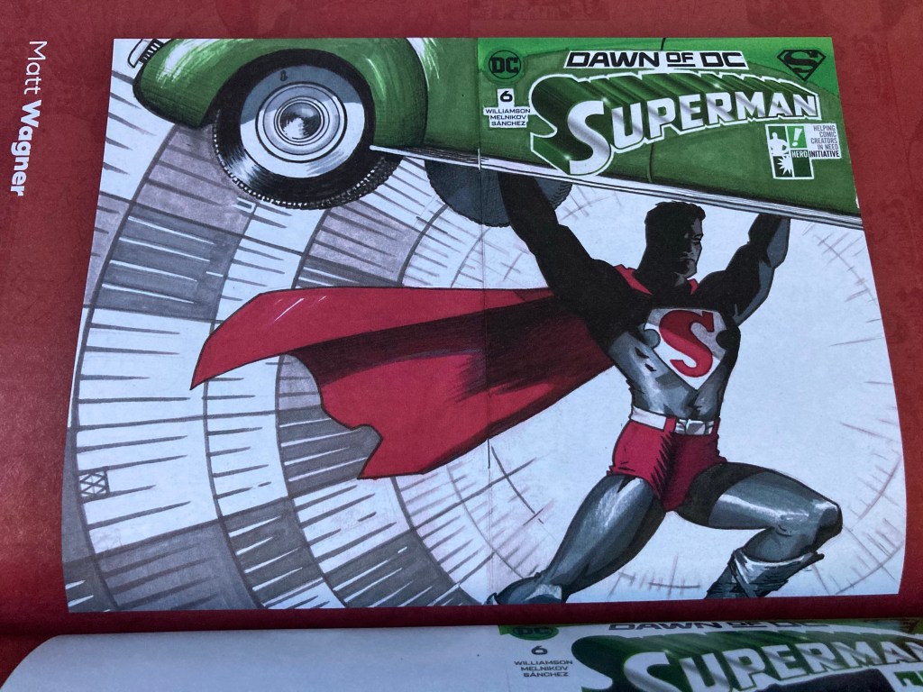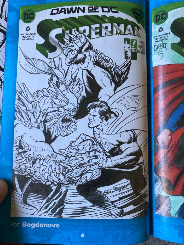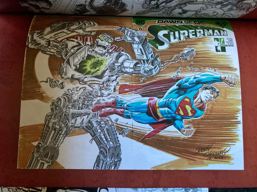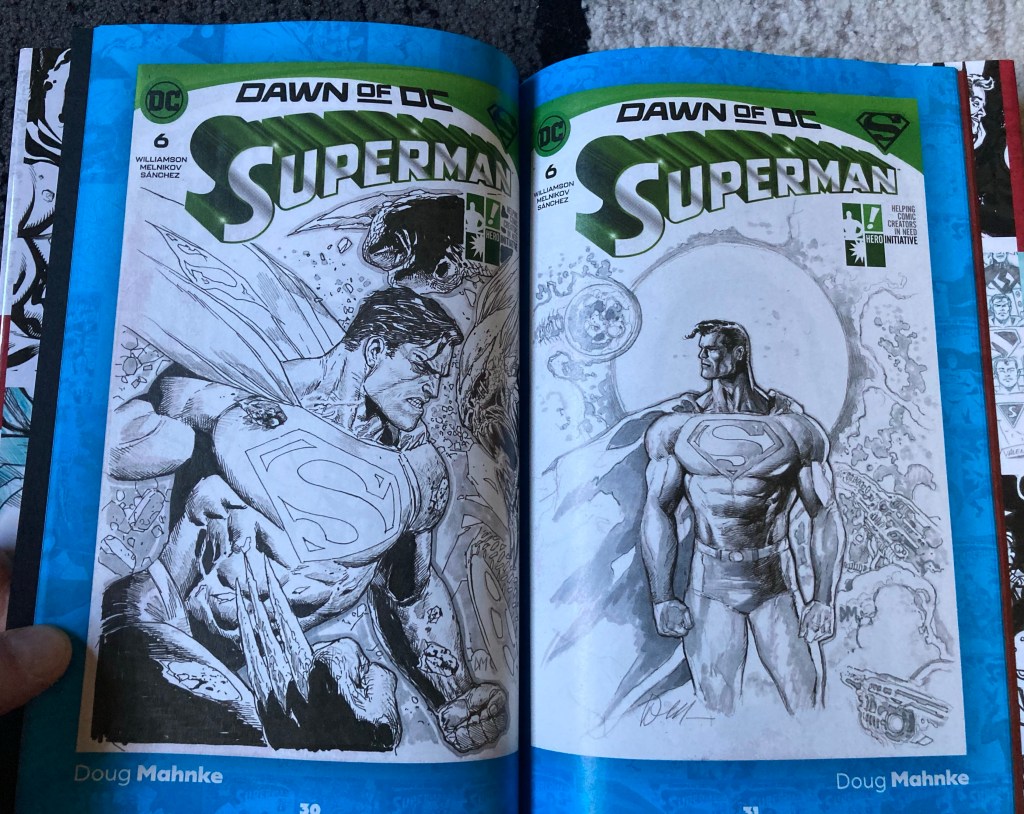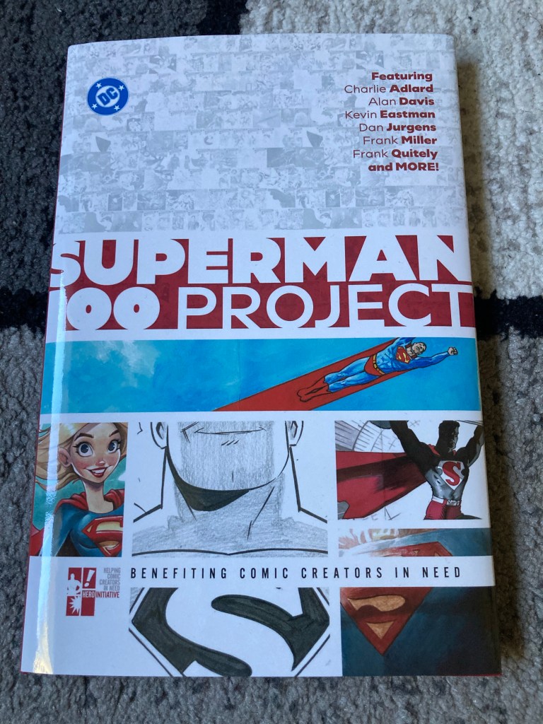 I had heard about the series of “100 Projects,” and had seen designated covers of comics that various artists would draw and donate to raise funds. Every so often, a comic company will release an issue with a blank cover, and as I understand it, 100 different artists draw a black and white or cover sketch which are not only sold but then compiled by Hero Initiative into a collected edition of art. When I heard there was a Superman version coming out, my curiosity was piqued.