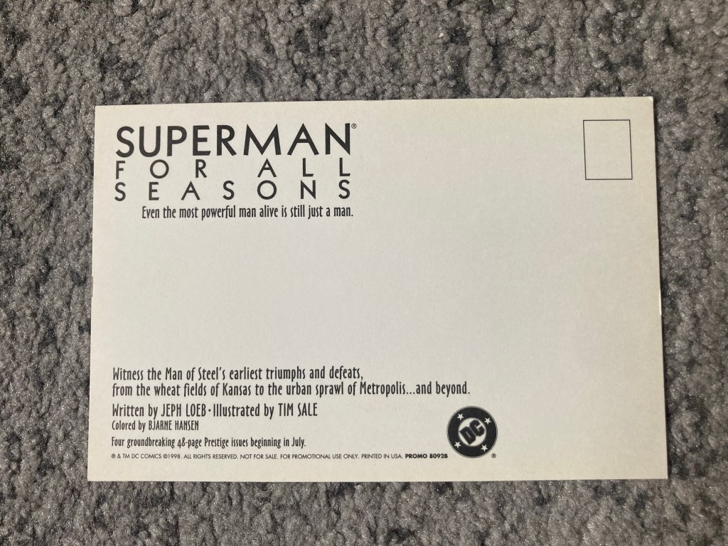 In addition to these two beautiful books, not too long ago I also purchased a promotional postcard of Superman For All Seasons, a nice little gimmick DC gave to comic book stores to promote the book’s upcoming release back in the day.